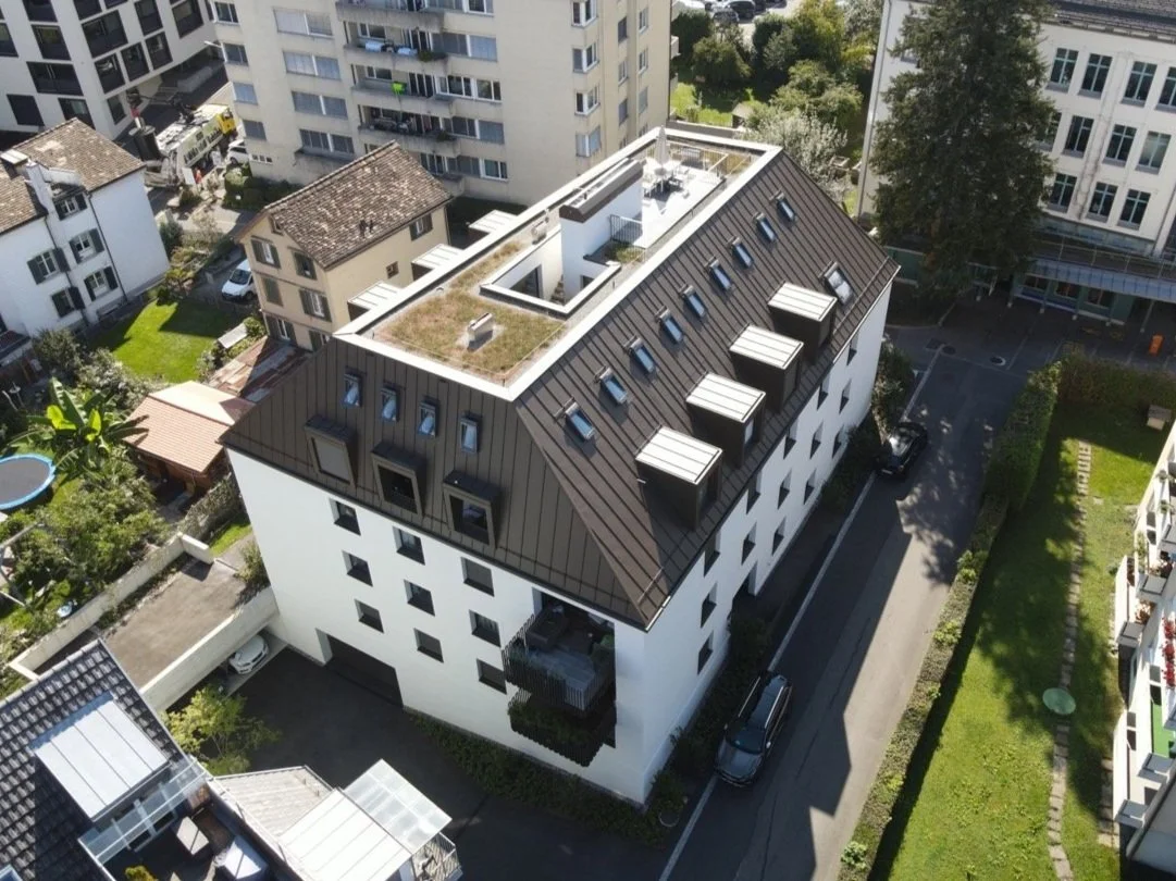 Bei diesem Mehrfamilienhaus durften wir die Spengler-Arbeiten in farbigem Aluminium realisieren. Auch das Flachdach ist von uns verlegt und sorgt für schöne Aussichten.